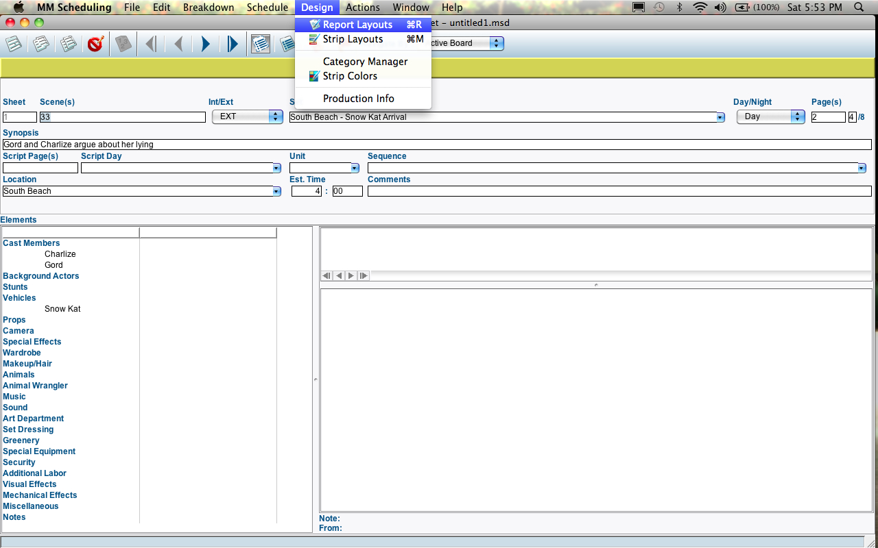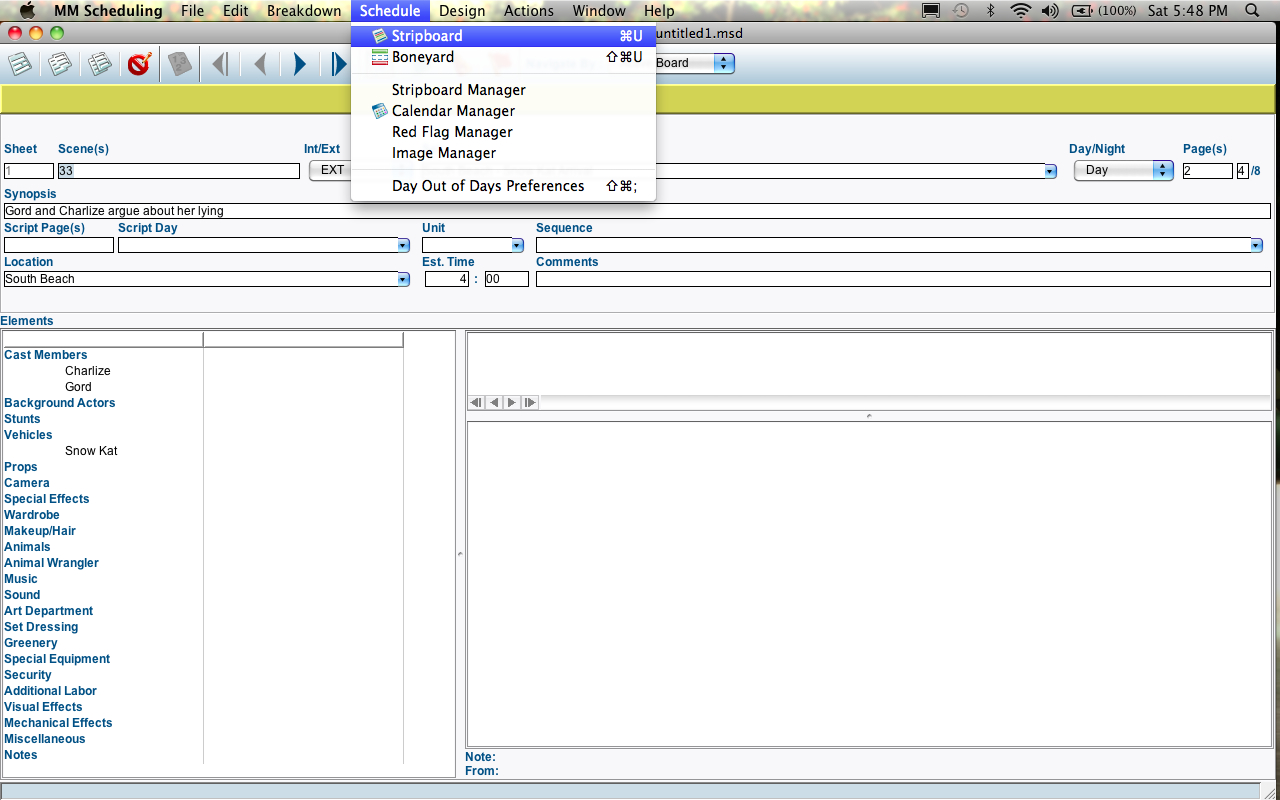 The great thing about MMS is that it allows you to simply input all of the elements of your script and creates a shooting schedule, breakdown sheets, day out of days, cast breakdowns and more.